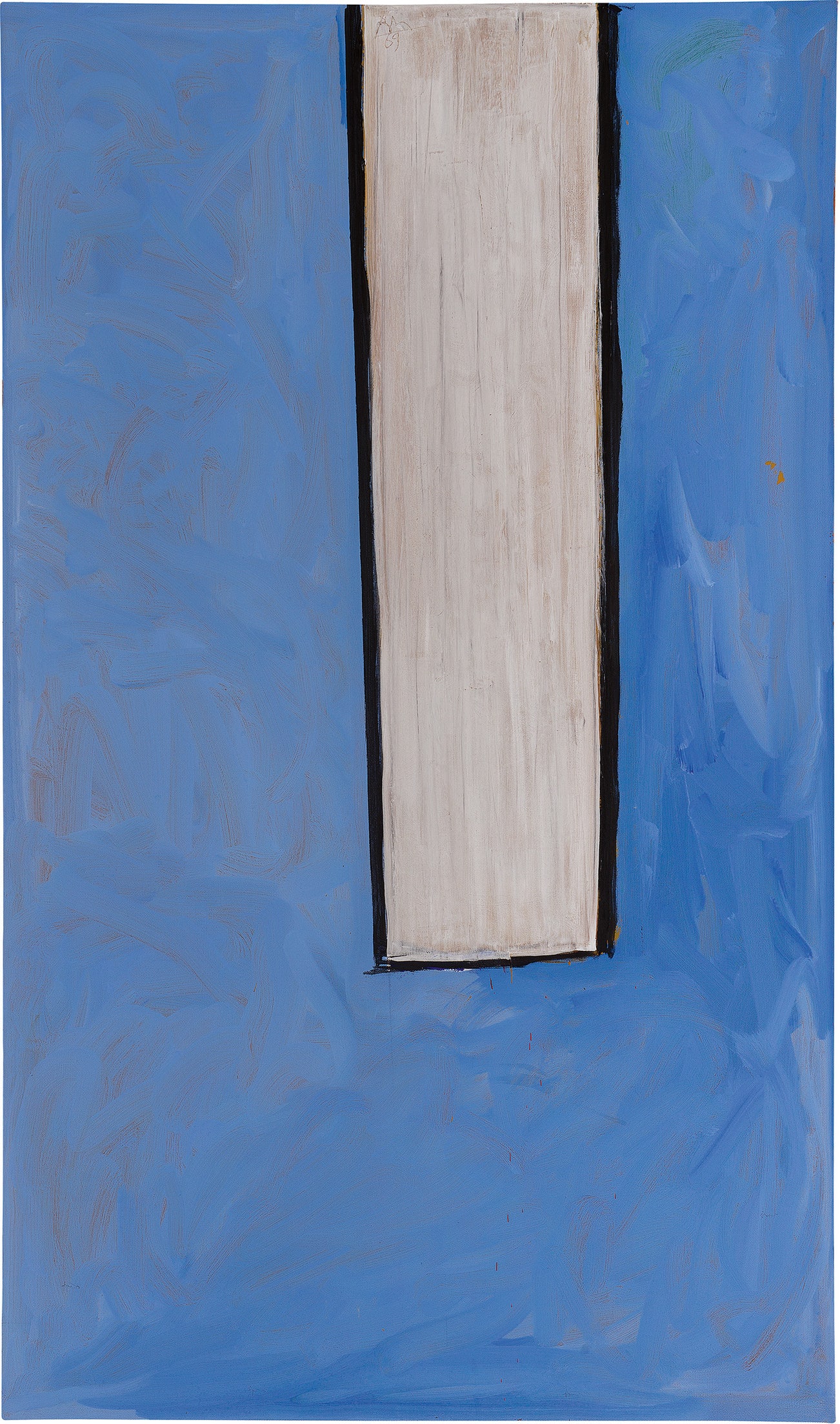 Resplendent in color and gesture, Robert Motherwell’s Open No. 116: La France Open envelops the viewer in an atmospheric blue field of color anchored by a luminous white window-like form outlined in bold black lines. As one approaches the vast surface, hints of green, ultramarine blue, sienna and red begin to reveal themselves behind the veils of pale blue and white paint that Motherwell has gesturally applied in subtle, oftentimes semitransparent layers. Completed between 1983 and 1985, this work is the impressive result of over a decade and a half of constant re-working of the canvas: Motherwell began painting the work in 1969, initially conceived it as Open No. 116: In Sienna, Blue and Green, but over the years repeatedly revised the canvas until achieving its current, final state. Exemplary of Motherwell’s characteristic process of revision, this painting hence simultaneously exhibits elements of his early Opens, as well as the looser, more gestural style that Motherwell pursued in the last decade of his life in the 1980s. An ode to the color blue, Open No. 116: La France Open represents a striking continuation of Motherwell’s celebrated The Blue Painting Lesson paintings from 1973-1975, which reside in the Wadsworth Atheneum Museum of Art, in Hartford.