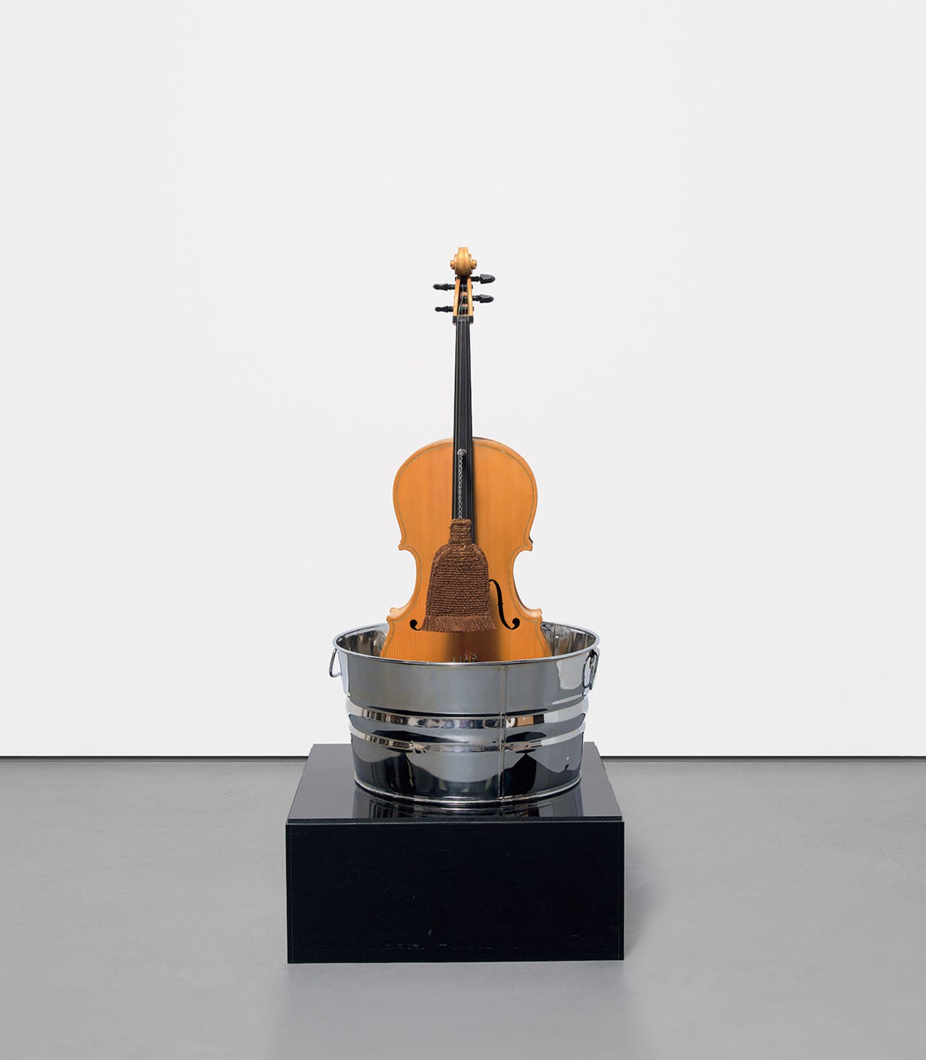 Cello, chrome-plated wash tub, glycerine, Chinese scrollmaker's brush, and mirrored Plexiglas.