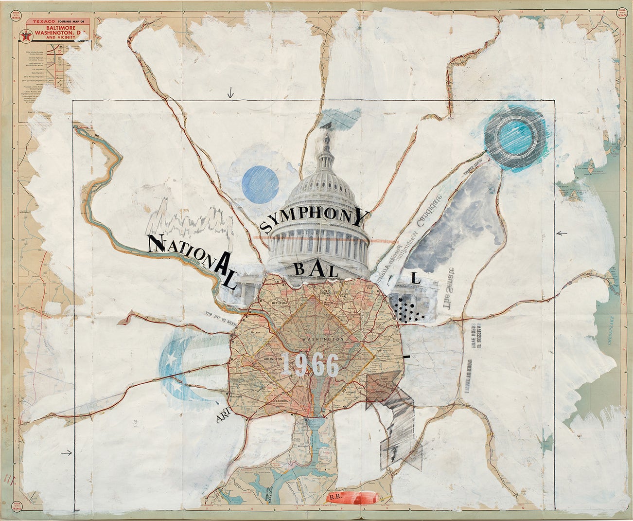 Robert Rauschenberg, an undisputed leader in the American avant-garde, was highly prolific, as he worked in a variety of mediums throughout his life. The artist most notably pushed the boundaries of conventional artistic practice by integrating utilitarian items into his work in a Duchampian style. Referring to these works as Combines, Rauschenberg used ordinary objects, like newspapers and photographs, as artistic materials, seeking to work between the gap of art and life. In National Symphony Ball, Rauschenberg’s interest in everyday materials is palpable, as he presents the viewer with an intricate imagining of the American capital, Washington DC. Leaving the central portion of the city map visible, Rauschenberg creates a shaded image of the Capitol building, planetary forms, and text saying “National Symphony Ball” overlayed in bold lettering. While the artist predominantly covers the map with white paint, the red lines of the map lead towards the city center. In using an existing material, Rauschenberg’s use of utilitarian materials speaks to the greater politics and economics of American life.