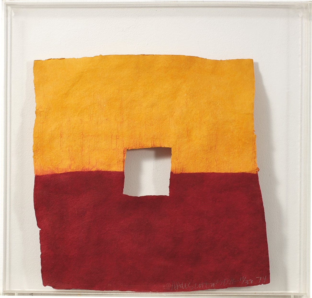Handmade paper with collage in colors, the full sheet, contained in the original acrylic exhibition case.