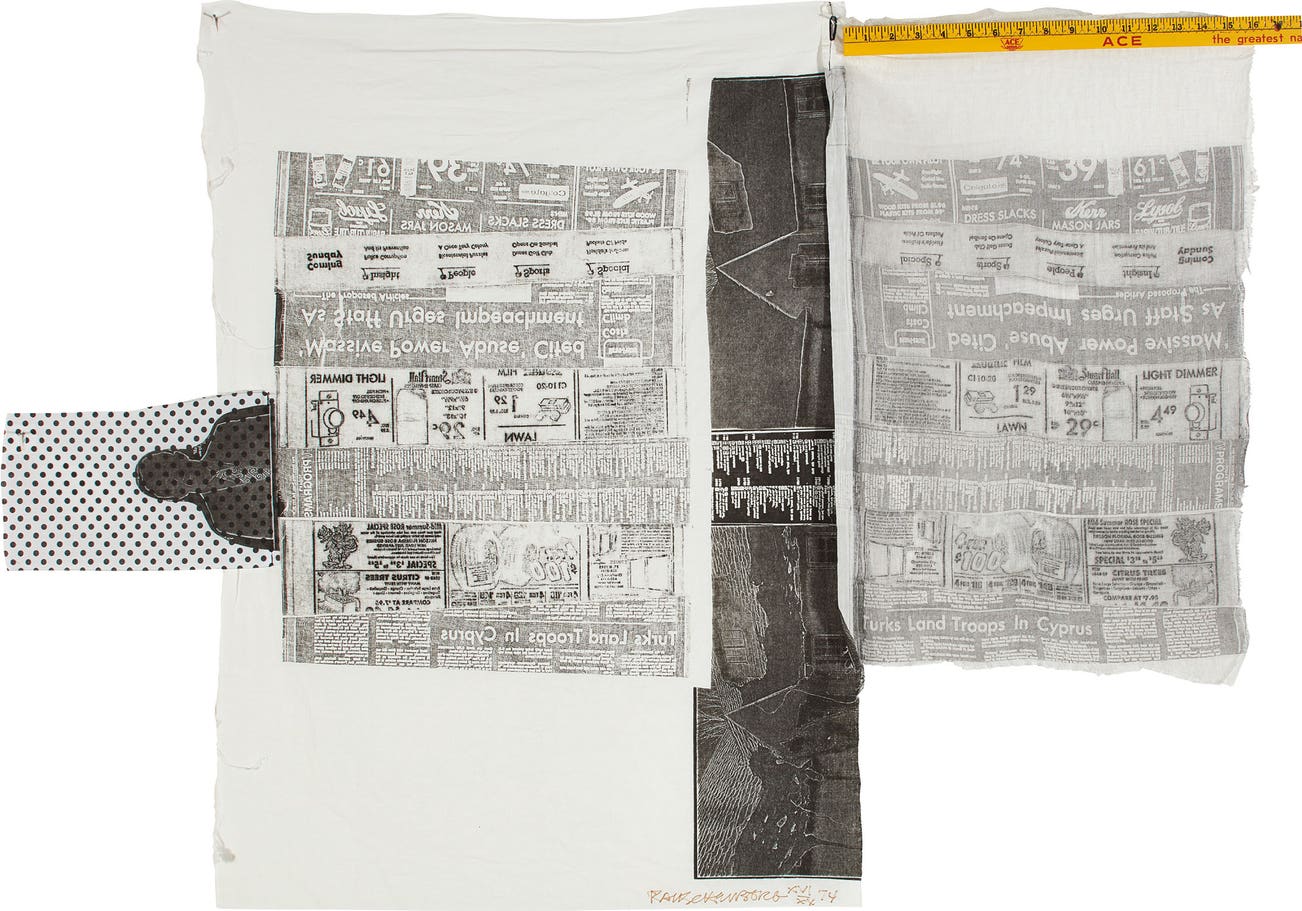 Airport Suite was Rauschenberg’s first intaglio project. Not only was the printing material innovative, but the method of printing was totally new. By folding fabrics of differing weaves, he was able to print on and through the materials simultaneously. After printing, the fabric was unfolded and the sections sewn. He achieved images of great expansiveness through a single press run. He further extended the visual impact of the images by additions – bottle caps, rulers, and his entire collection of neckties.”