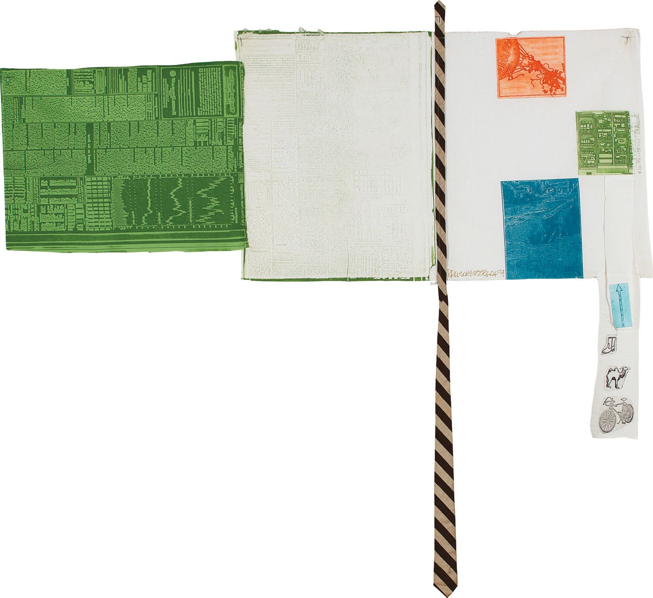Relief, intaglio and collage in colors, including the artist's personal tie, on white cotton and green muslin, machine buttonholed for mounting.