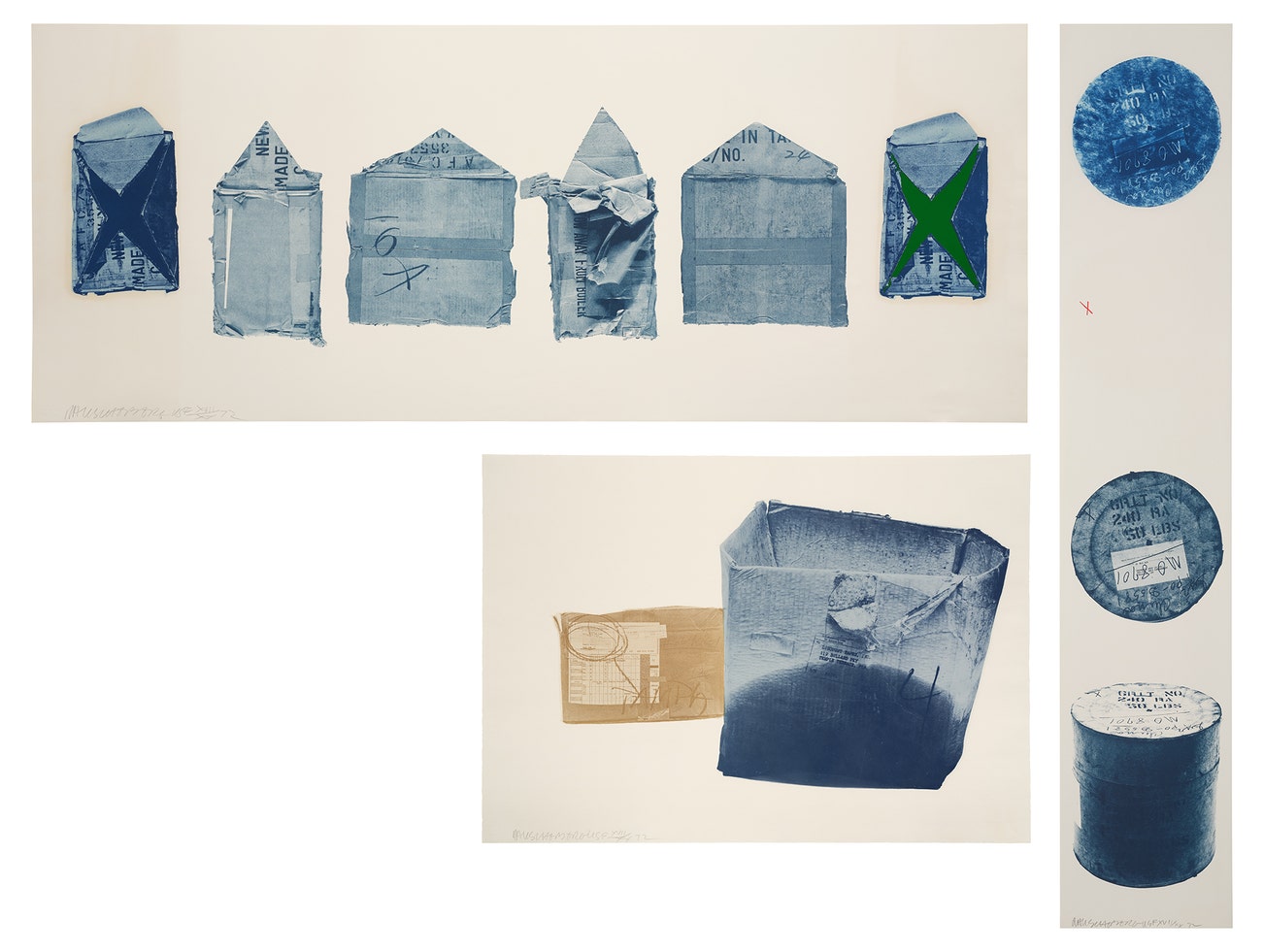 Two lithographs with blueprint in colors and one blueprint with sepiaprint in colors, on Rives BFK paper, with full margins.
