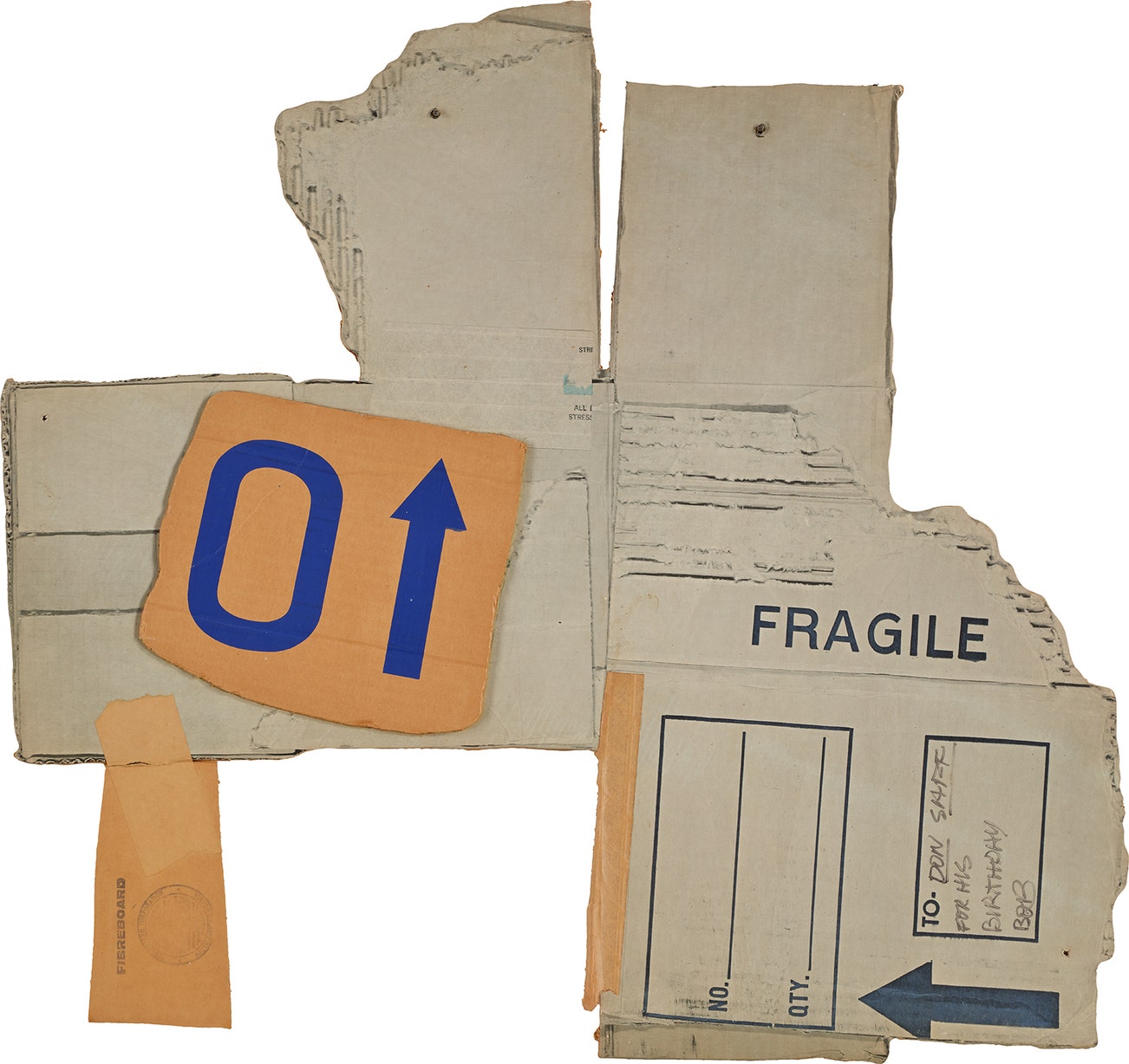 Collage print with photo offset lithograph, screenprint and tape, on corrugated cardboard, the full sheet.