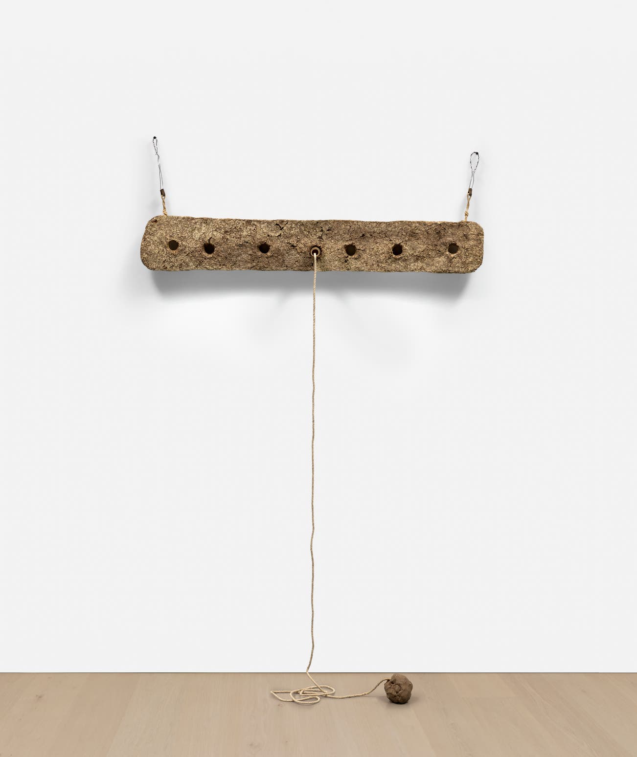 For his second project outside the Gemini workshop, Rauschenberg and members of the Felsen family and Gemini staff traveled to the Gandhi Ashram in Ahmedabad, India to create Bones, airy, fragile constructions of handmade paper and bamboo strips and Unions. The six Unions are made of rag-mud, a mixture of paper pulp, fenugreek powder, ground tamarind seed, calk powder, gum powder, copper sulphate, and water. The rag-mud’s strong aroma lasts long after the material has dried and is a distinctive feature of this series. Connected to the hand-shaped rag-mud forms are ropes, dyed strings and bamboo.