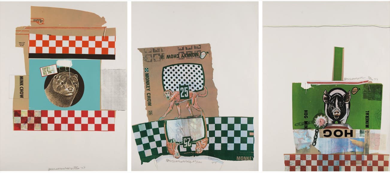 Three screenprints in colors with applied string and fabric, on smooth wove paper, the full sheets,