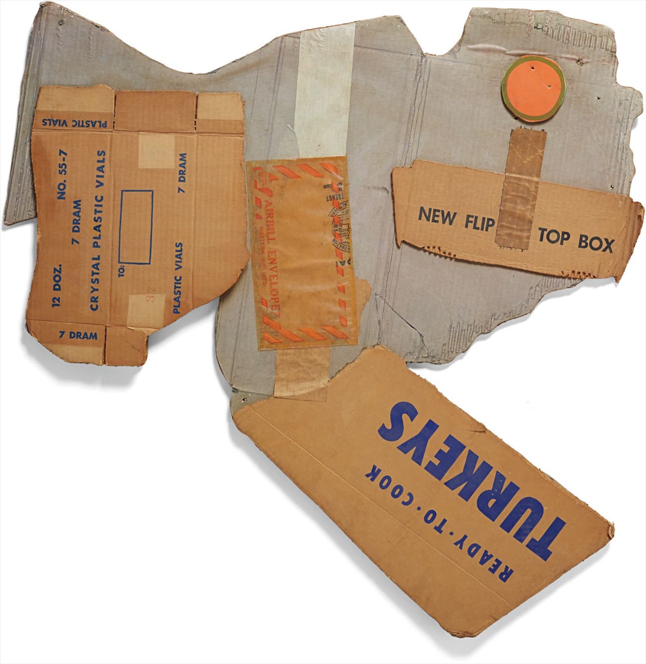 Collage print with tape, steel staples, photo offset lithograph, and screenprint in colors, on corrugated cardboard, the full sheet,