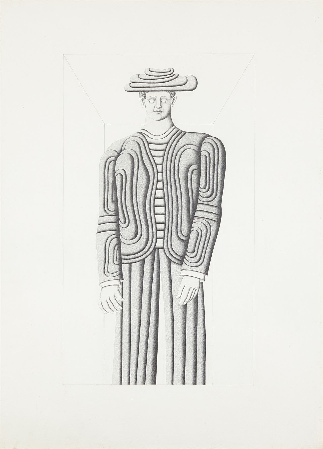 This particular work is one from a series of drawings that explore the human figure. The drawing’s surface is composed of familiar planes, giving the figure’s clothing an architectural quality. The blank, empty eyes and Mona Lisa-like smile make the figure mysterious but also inviting. Aizenberg chose to ground the man in space by using simple foreshortening lines to form a box-like room from which the figure emerges towards the viewer. This drawing exemplifies Aizenberg’s prominence in the Latin American artistic tradition that vacillates between Surrealism and geometric abstraction, found in the work of other prominent artists like Guther Gerzso and Roberto Matta.