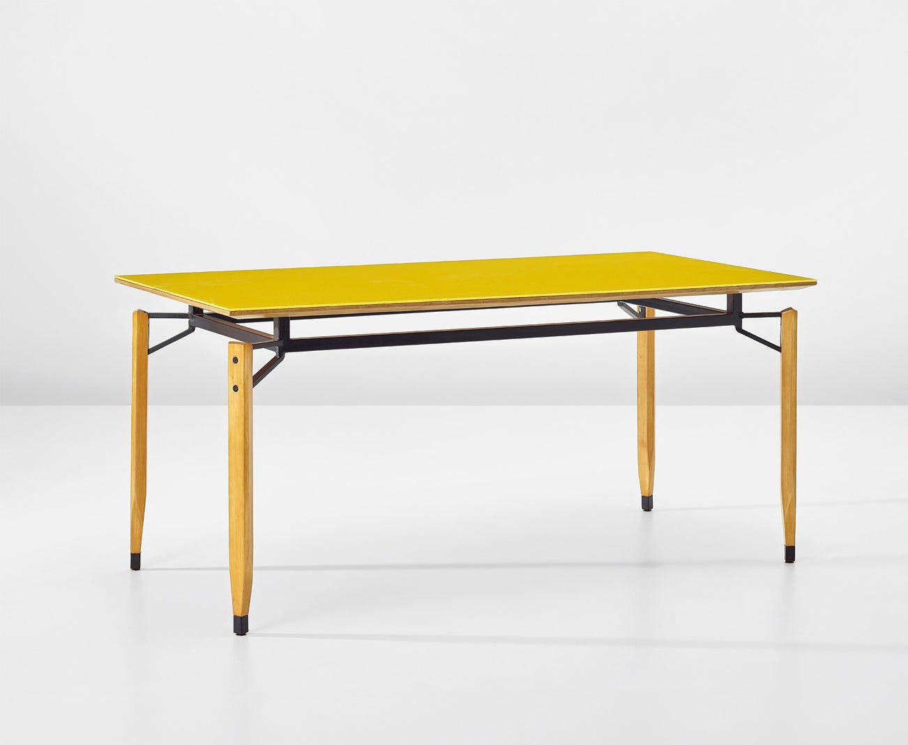 Reverse-painted glass, fruitwood-veneered wood, fruitwood, painted steel.