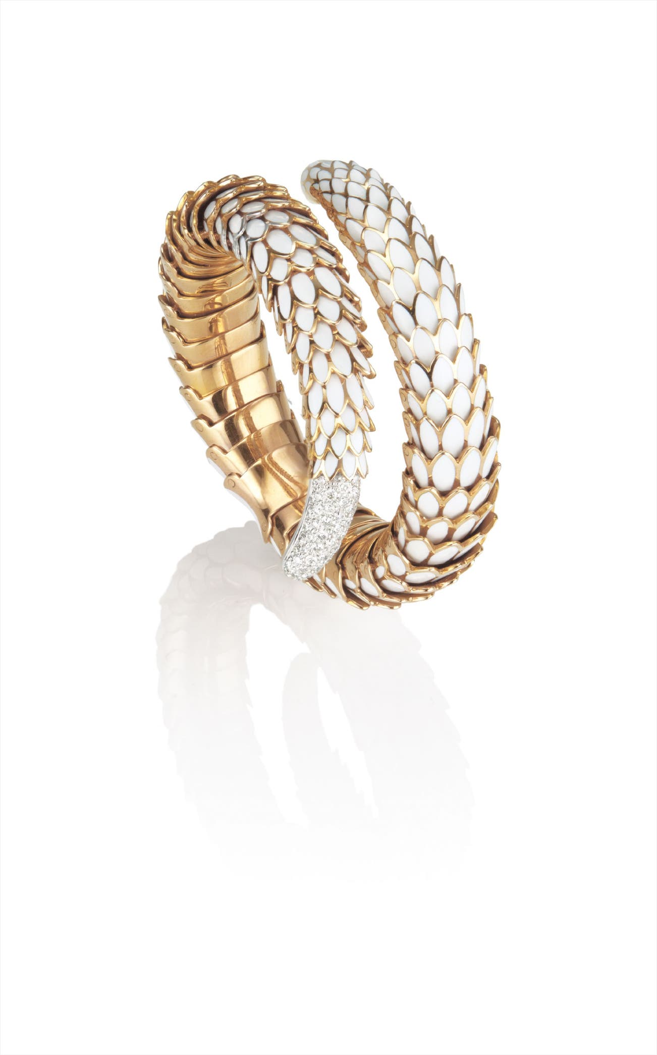 Designed as a coiled serpent of springband design, with articulated white enamel and gold scales, mounted in 18K yellow gold.