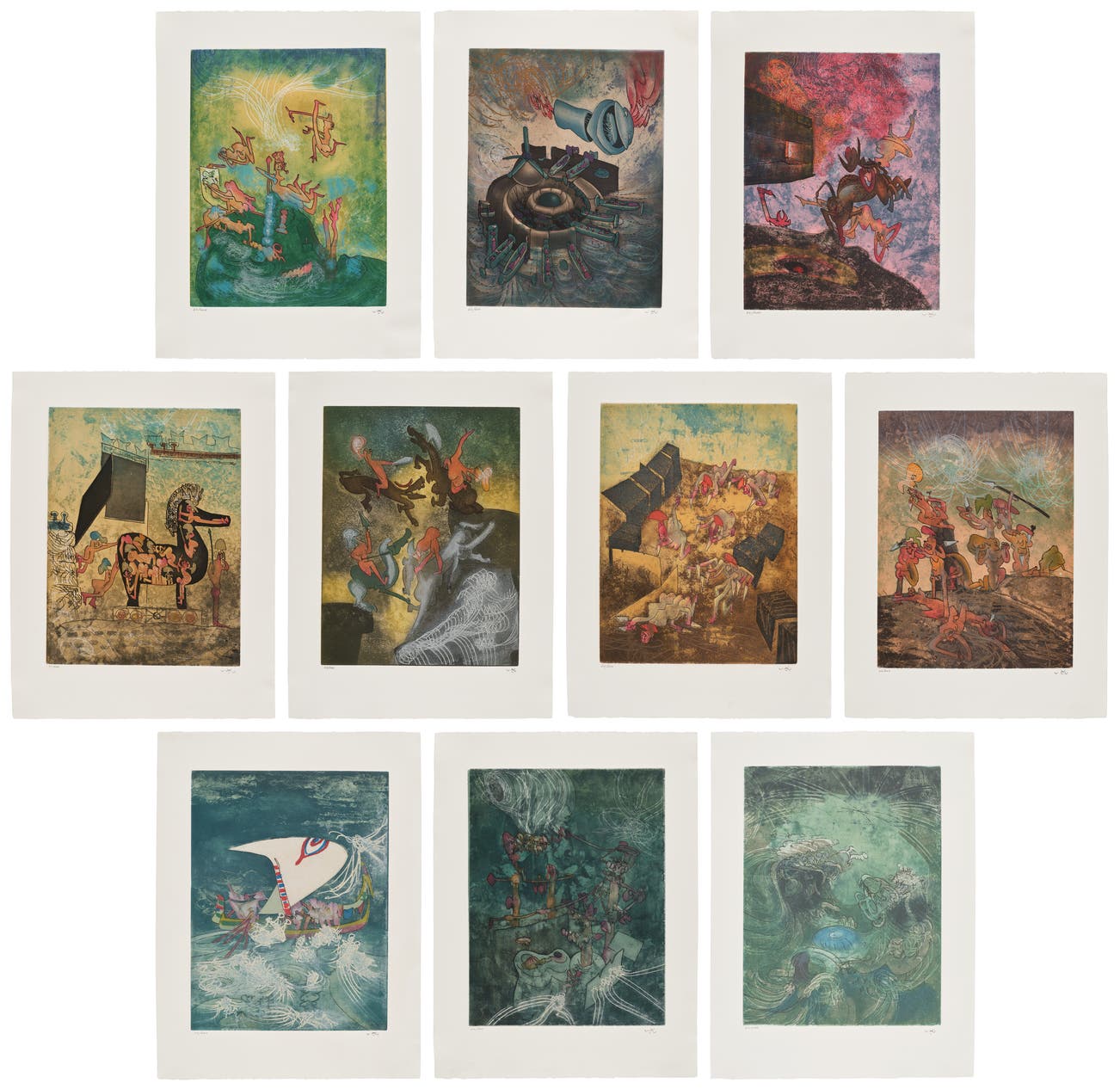 The complete set of 10 etching and aquatints in colors, on Arches paper, with full margins, all loose (as issued), all contained in the original linen covered portfolio.