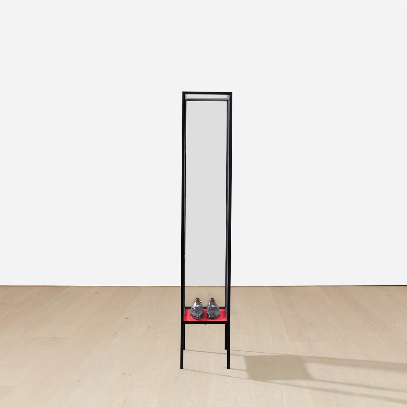 leather and metal handmade shoes and felt in a steel and glass vitrine