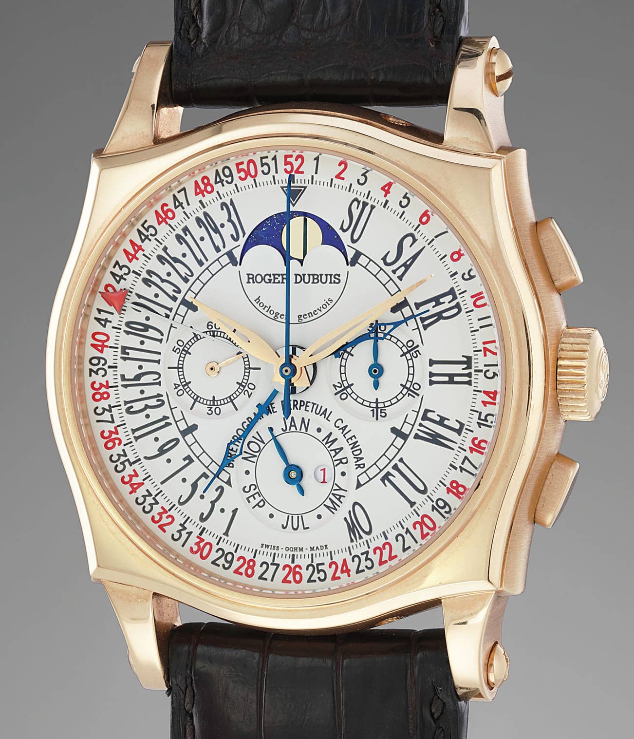 After a long stint at Patek Philippe, Roger Dubuis created his own eponymous brand in 1995. As an independent watchmaker he developed the “Sympathie” that was an audacious and innovative case design. The present Sympathie retrograde perpetual calendar stands out of the normal production by numerous point. The high end Lemania caliber, the same as the one powering Patek Philippe references 3970 and 5970, has been beautifully modified to display the retrograde calendar. Made in Geneva and thanks to the quality of this movement based on a profound respect for tradition, it has been granted with the Geneva seal. The large 43mm diameter distinctive pink gold case’s shape is unmistakable and the dial gives an impressive amount of information. In addition to the moonphase, this perpetual calendar shows the day, date, month, leap year and less usual, it even displays the week on the outer ring of the dial. This watch was released as a limited edition of 28 pieces. Brave, bold and technically sophisticated as the brand likes to define itself, this watch can be seen as the Geneva watchmaker's legacy.