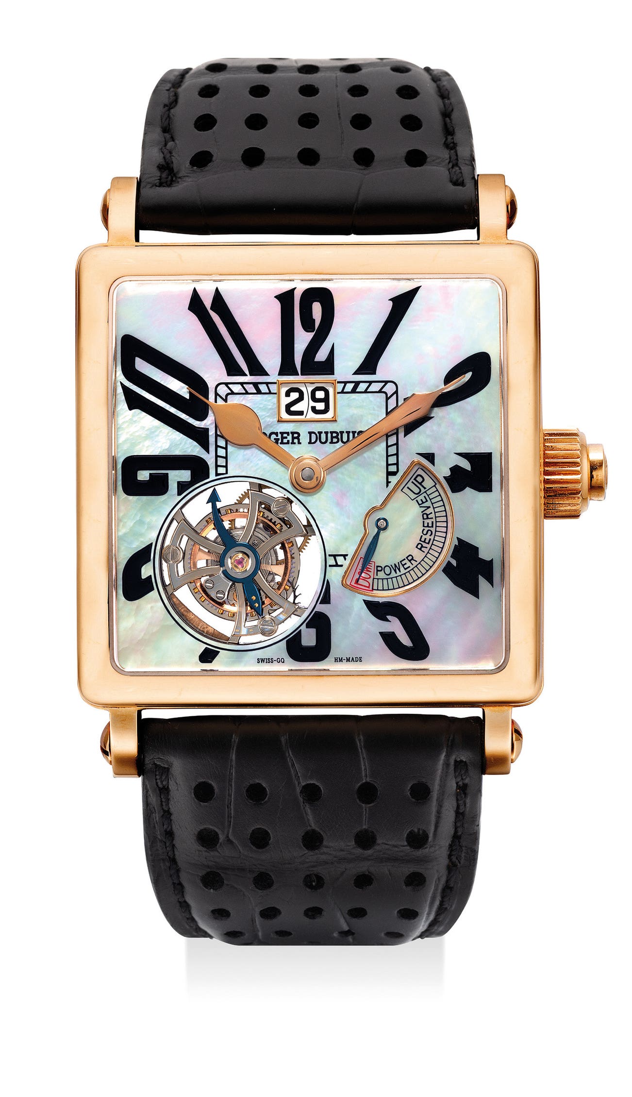A fine limited edition yellow gold square-shaped wristwatch with tourbillon escapement, date, power reserve indicator and “mother of pearl” dial, numbered 20 of a limited edition of 28 pieces