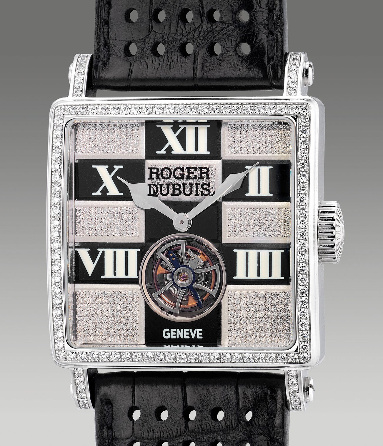 The present example Golden Square features a tourbillon with a playful asymmetrically checkered diamond-set dial from circa 2006 is numbered 1 of a limited edition of 28 pieces. Accompanied by the full set of accessories, the present early Roger Dubuis timepiece is a fun timepiece to sport for the collector of extravagant timepieces.