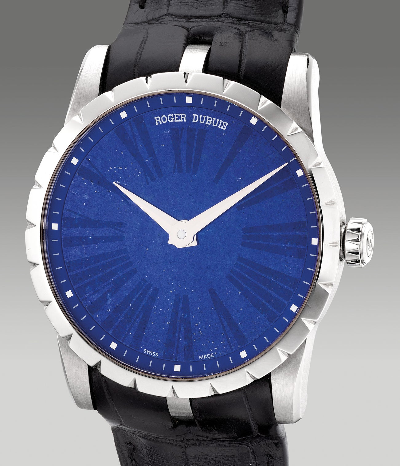 The dressy appeal of the present white gold limited edition Roger Dubuis timepiece is further enhanced by the attractiveness of its vibrant blue Lapis Lazuli dial. All the rage in the 1960’s, the deep blue color of this precious hard stone has been prized since antiquity and has seen a resurgence in recent years. The strong character and design of the Excalibur case is now complemented by the purity and the starry-night emotion that comes with the dial.
