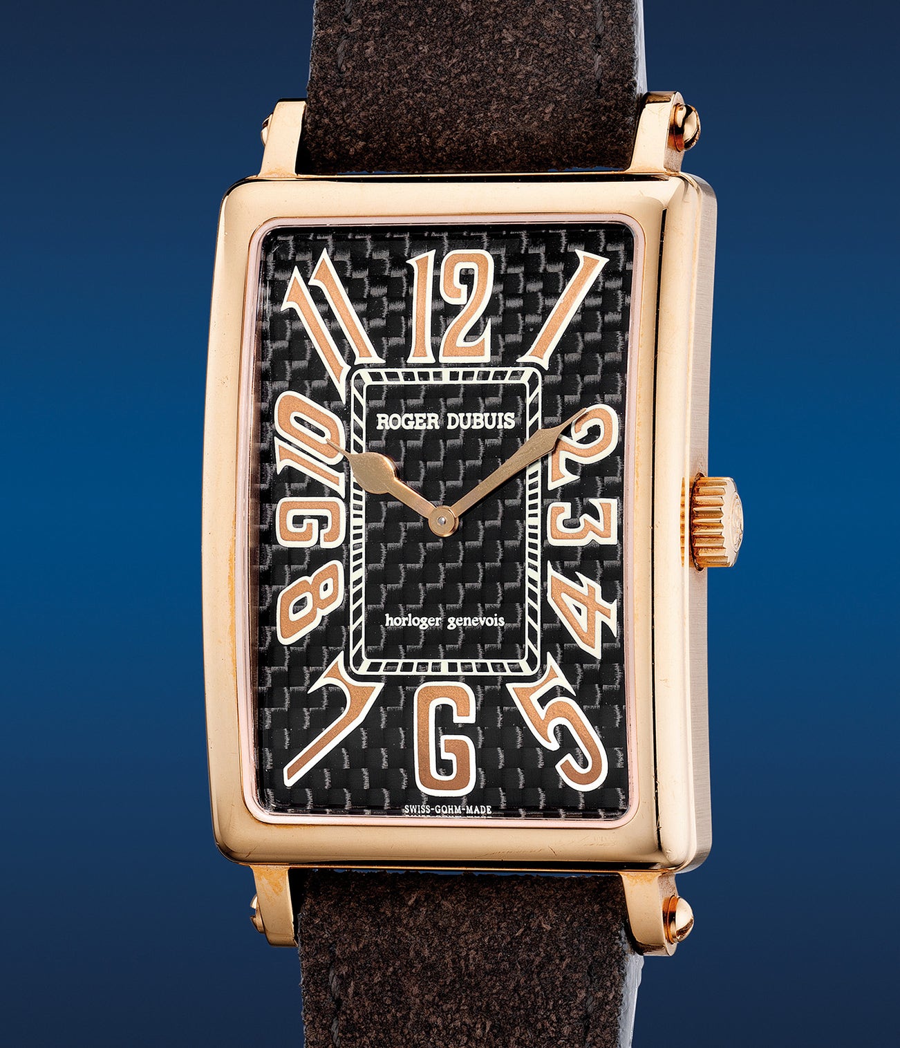 The present Roger Dubuis Much More wristwatch in pink gold features an eclectic carbon fiber dial paired beautifully with oversized Arabic numerals in gold. First released in the early 2000s, the rectangular-shaped model was offered with a variety of iterations to cater towards the growth of trendy collectors. Offered in excellent overall condition and accompanied by its original certificate and box, this early Roger Dubuis is a versatile timepiece to wear casually and in formal occasions.