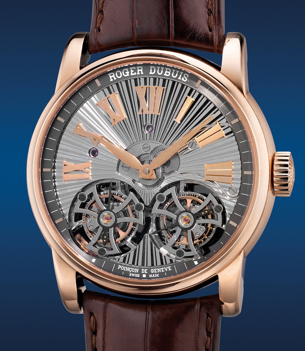 The Hommage Double Flying Tourbillon is instantly recognisable with the placement at 6 o’clock complimented by the guillochè decorated dial combined with applied Roman numerals giving it a distinctive modern look. As the ultimate finishing touch to this outstanding timepiece, the distinctive signature of Mr Roger Dubuis on the back of the timepiece, visually symbolizes his seal of approval.