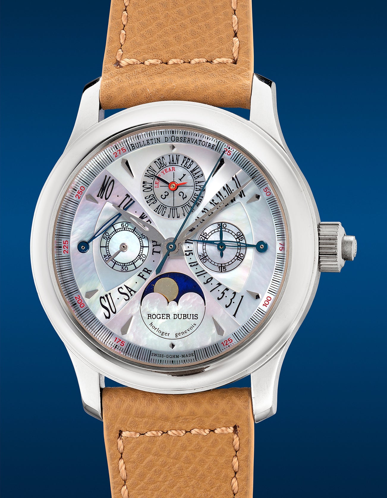 Based on the Lemania 2310 with inspiration drawn from classic Patek Philippe models, the Hommage monopusher chronographs are one of the early timepieces made by legendary watchmaker Roger Dubuis. Since the establishment of his own brand in 1995, it is understood that each variant is to be made in a series of no more than 28 pieces. These watches were chronometer-graded with certification from the Besançon Observatory and finished with exceptional quality. Know to be the largest sized made for the Hommage series at 40mm diameter, the H40 Monopusher is a sight to behold with very few examples resurfacing in the market and have become increasingly collectible. What makes the present Roger Dubuis timepiece exceedingly rare is that not only it is a Monopusher, it is also a perpetual calendar complication with a combination of a gorgeous mother-of-pearl dial. Featuring the symmetric stylistic indication of the date and day of the week, the wearer can simultaneously locate the information under a pair of skeletonized hands finished in attractive blued steel. Under sunlight, the meticulous details on the mother-of-pearl dial is stunning and everchanging. Finessed with pride, the movement bears the mark of excellence, the Poinçon de Genève.
