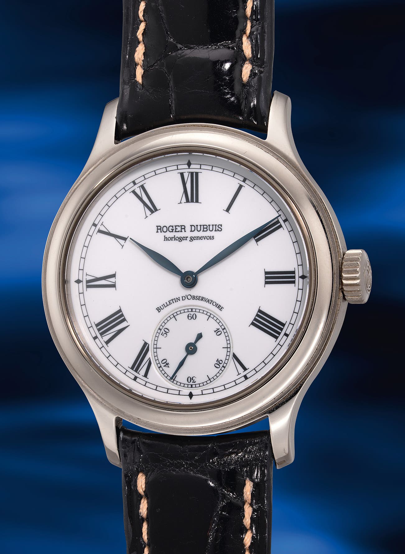 The Roger Dubuis Hommage Condottieri, introduced in the mid-1990s, stands as a defining statement of the watchmaker’s philosophy and craftsmanship. Created shortly after Dubuis launched his own brand, following four decades of experience at Longines and Patek Philippe, the Condottieri reflects a return to traditional Genevan watchmaking values. It features a snow-white fired enamel dial with painted Roman numerals and blued leaf hands, all housed in a substantial 18K white gold 40mm case.