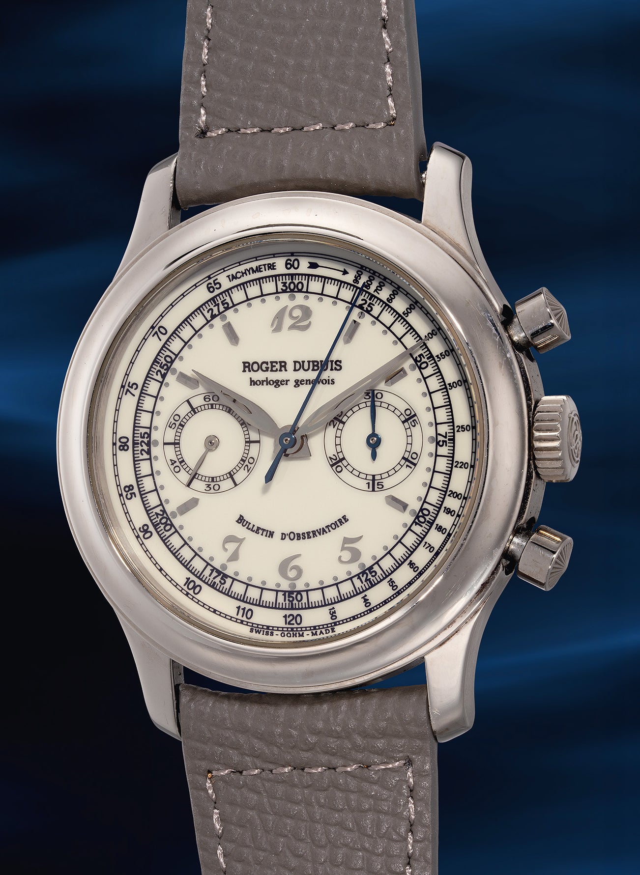 The movement is based on the Lemania 2310 ébauche, which is also used in the renowned Patek Philippe ref. 5070. Beautifully finished, the movement bears the Poinçon de Genève seal and the presence of the "Bulletin d'Observatoire" signature on the dial went a step further that this movement underwent accuracy testing at the Besançon Observatory, which held more stringent standards than the Contrôle Officiel Suisse des Chronomètres (COSC) - remarkable achievements for an independent young manufacture.