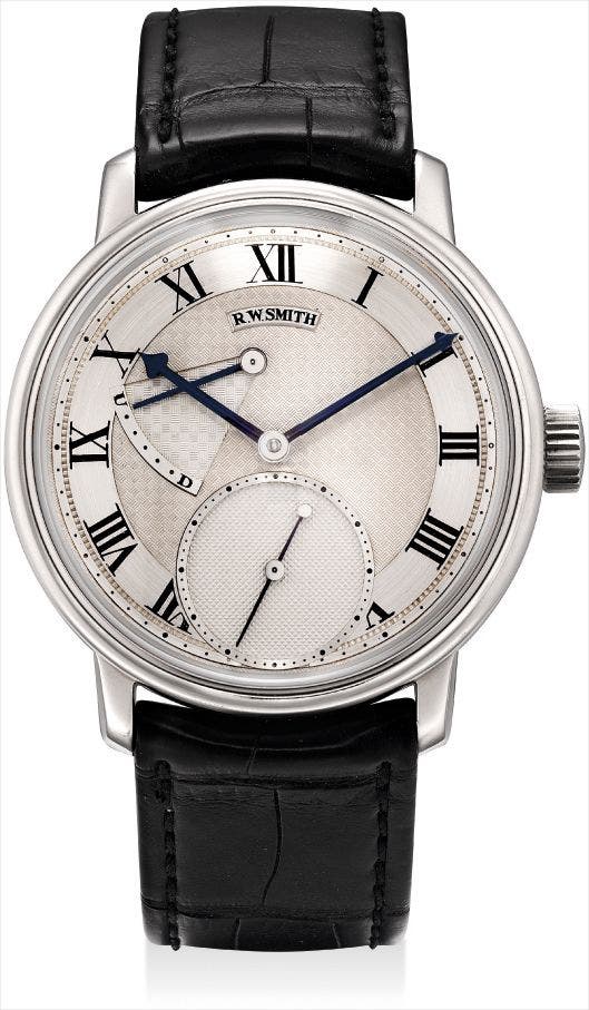 With <em>Roger Smith</em> Certificate, additional black crocodile leather strap, polishing cloth, leather wallet, fitted presentation box and outer packaging.