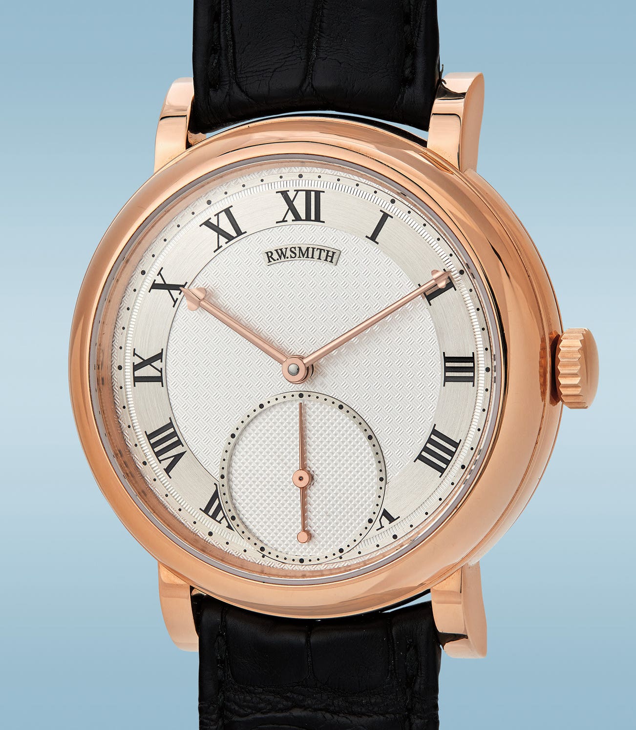 The present Series 1 is also, remarkably number 1, hence, the very first produced, assembled, and likely delivered of this new generation of Series 1. It comes directly from the collection of the original owner, a staunch champion of British watchmaking. It measures 40mm in diameter, rendered in 18K pink gold, with Roger Smith’s characteristic hand-engraved dial and unique elongated spade-tipped hands. The movement is finished in a classical English style, with frosted and gilded plates, a floral scroll motif hand-engraved on the barrel bridge and balance cock, and of course, Smith’s refined and honed Daniels co-axial escapement.