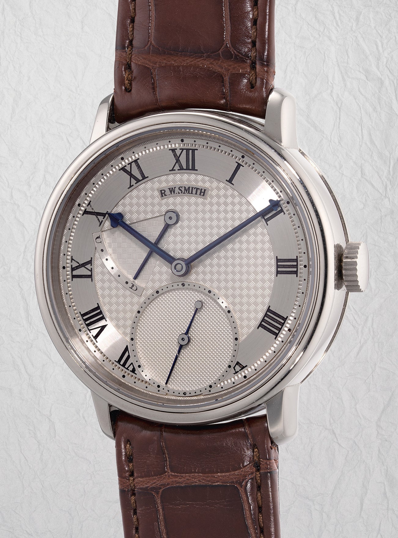 The present Series 2 is No. 4 of the extraordinarily rare and elegant white gold Edition 3. Within this early 38mm diameter case lies the shared horological mastery of both Daniels and Smith on full display – boasting an exquisite, engine-turned solid silver dial with blued steel hands, hand-carved lettering and Roman numerals, hand-engraved plates, frosted finishes, every component hand-crafted with artisanal devotion. Its immaculate English-finished plates and bridges epitomize Smith's technical brilliance following in Daniels' footsteps.