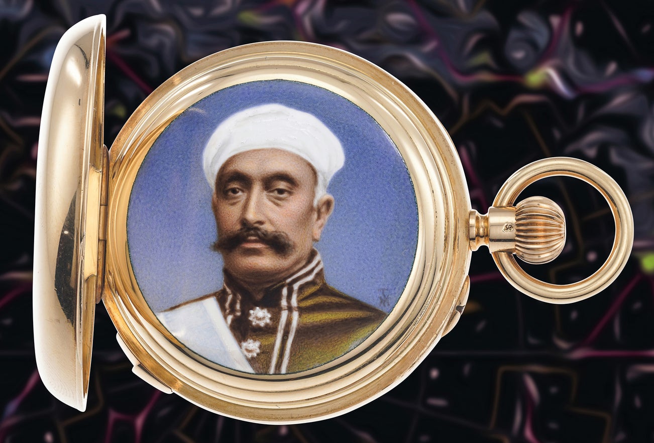 The caseback elegantly features the monogram JC intertwined with the initials SOD. The inner cuvette features a lavish enamel portrait of an Indian Rahj.