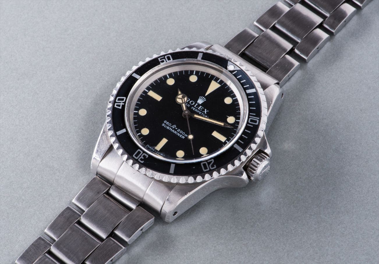 A special gas escape value was fitted to their cases, designed to release built-up pressure from the case during a diver's resurfacing and decompression. While working inside pressure-controlled diving chambers, the tiny helium atoms of the air mixture that COMEX divers breathed would penetrate the case and get trapped inside, causing their watches to burst upon resurfacing. The helium escape valve was a brilliantly simple solution that allowed the helium to easily escape. The COMEX offered here is part of the family of some of the rarest of all Submariner models. All COMEX watches and all reference 5514 were exclusively reserved for the firm and never available to the public for commercial sale. It’s preserved in overall excellent condition, with a charismatic dial with lovely and consistent latte colored aging on its hour markers and hands.