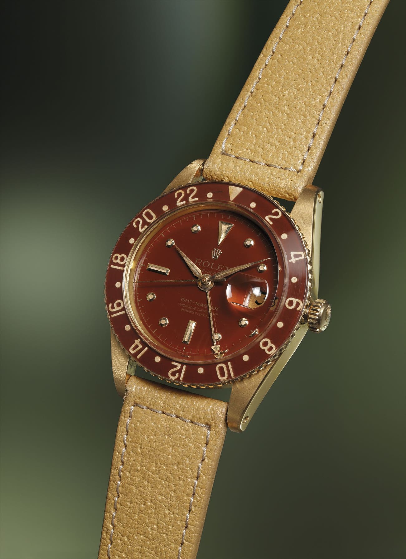 Given that the GMT-Master was created for specific, work-related purposes, most examples were cased in stainless steel. These watches were worn in the most practical sense and made to withstand the elements. Yet, Rolex also manufactured a very limited number of watches cased in yellow gold, and fitted with a brown bakelite bezel. Due to the immense fragility of these watches, it is incredibly rare to find examples fitted with their original bakelite insert. The fact is even more pertinent as most of the bakelite bezels were recalled by Rolex due to their radium content. The original GMT-Master eventually ceased production in 1959.