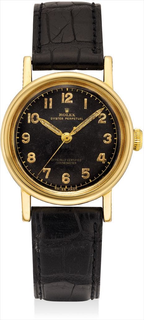 A rare yellow gold wristwatch with sweep centre seconds and black lacquer dial