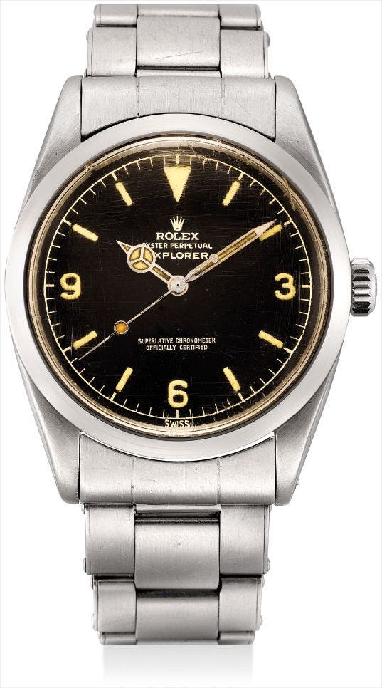 A rare stainless steel wristwatch with sweep centre seconds, black lacquer 'explorer' dial, bracelet, original guarantee and fitted presentation box