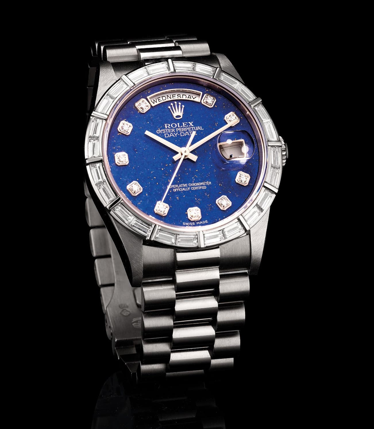 A very fine and rare white gold and diamond-set calendar wristwatch with sweep centre seconds, lapis lazuli hardstone dial, bracelet, original guarantee and fitted presentation box