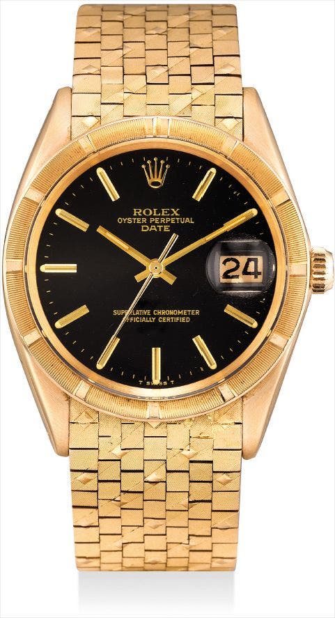A fine and rare pink gold wristwatch with sweep centre seconds, date and rare textured bracelet
