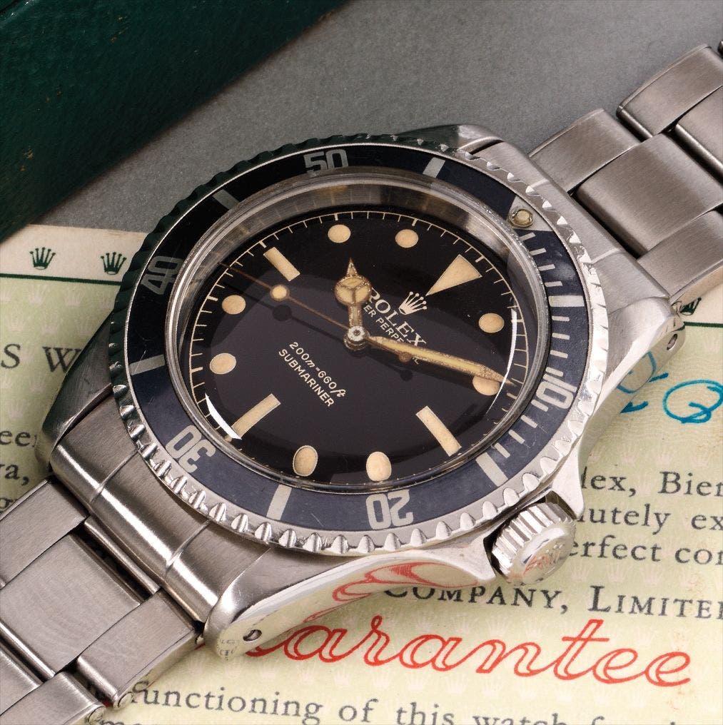 Collectors will be delighted by the present lot’s stunning condition, with a case that retains strong beveled lugs. The glossy dial with gilt chapter ring further impresses with its immaculate state of preservation. This dial is particularly rare as it displays an exclamation mark at 6 o'clock, believed to signify a lower amount of radium used for the luminous material. By this time, Rolex had realized the health hazards of using radium on their dials, and gradually transitioned to tritium. The luminous markers and matching hands have aged to a lovely cream color, and combined with the faded blue/grey bezel gives the watch a highly attractive, vintage appearance. Accompanied by its original box and guarantee card, it’s a trophy watch for collectors of rare Rolex sports watches.