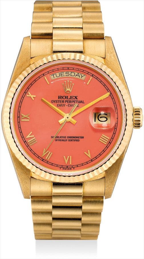 A fine and rare yellow gold calendar wristwatch with sweep centre seconds, candy lacquer 'Stella' dial and bracelet