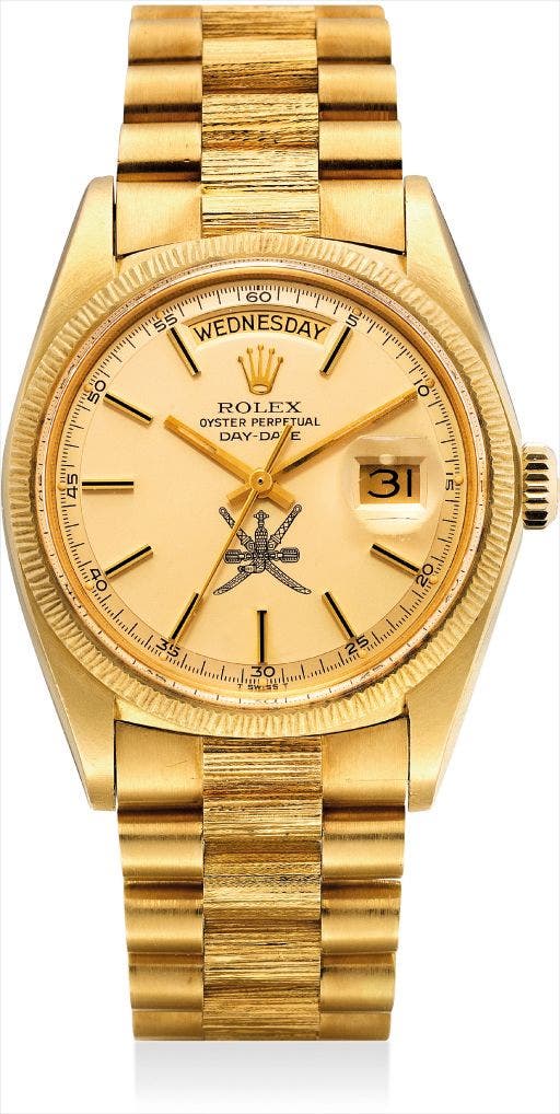 A fine and very rare yellow gold calendar wristwatch with sweep centre seconds, champagne dial and bracelet, made for the Sultanate of Oman