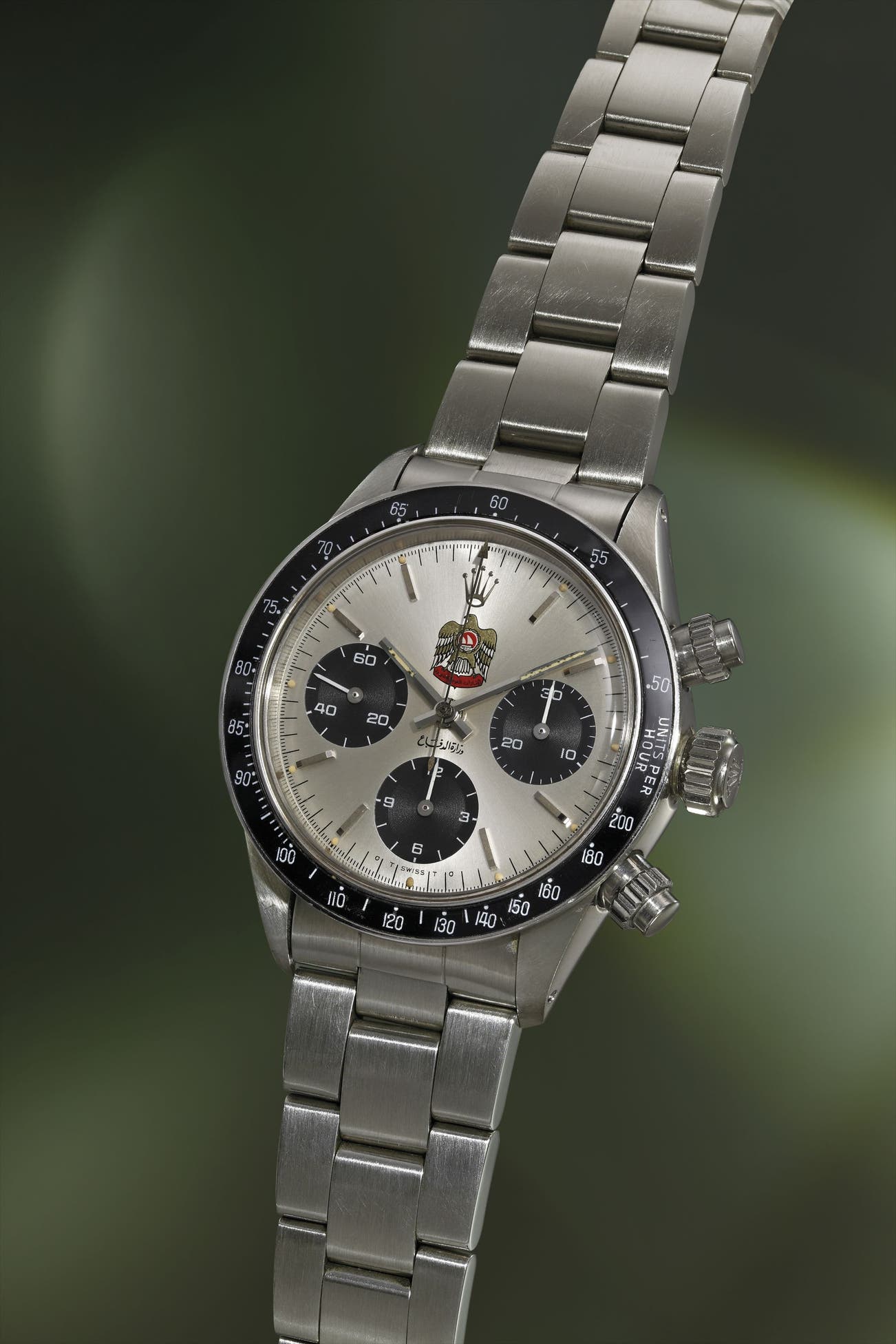Having never appeared at auction before, this correct reference 6263 features a custom dial with the UAE Quraysh Hawk. Made upon special request for Mohammed bin Rashid Al Maktoum, Emir of Dubai in the mid- 1970, the present watch was part of an order comprising a few dozen timepieces. Reference 6263, introduced to the market in 1969, was available until the mid 1980s. Fitted with an acrylic bezel insert and screw down pump pushers, the watch was a commercial success.