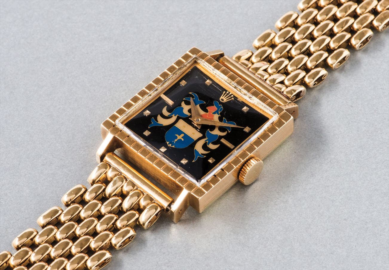 Only four Rolex watches, in form cases, featuring an enamel dial depicting a coat of arms are known to date. The dial of the present lot is the only one known in this configuration making this reference 9548 unique.