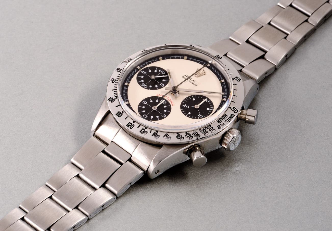 The present watch features the bright red ‘Daytona’ text at 6 o’clock standing out sharply in contrast with the matte white dial. The stepped outer minute track perfectly matches the black sub-dials with their white graphics. The luminous markers are all present, having aged to a grey-beige tone matching the luminous hands. This example is accompanied with its Rolex presentation box and additional Rolex Oyster bracelet, and is an excellent representation of the coveted “Paul Newman” Daytona.