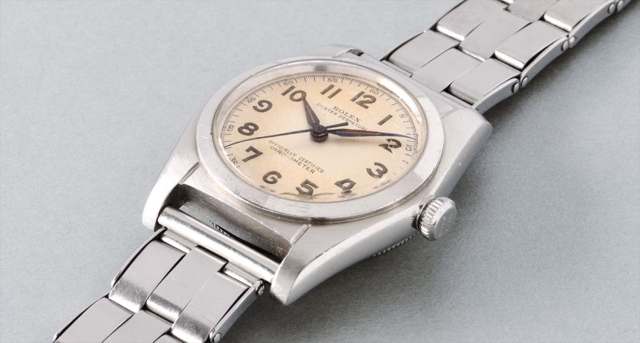 The present Rolex Oyster Perpetual “Bubbleback” has an elegant and simple dial with Arabic numerals that have aged to a lovely dark brown color. The case remained unpolished, retaining the graceful and sharp curves and edges as it originally left the factory. A true barn find, it comes fitted on a highly desirable expandable Oyster bracelet made by Gay Frères.