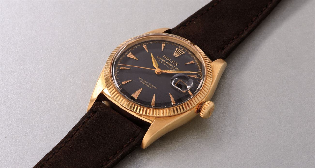 A rare and attractive yellow gold wristwatch with black dial and date
