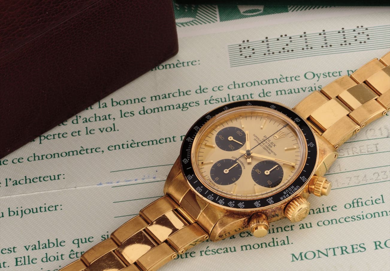 The reference 6263 and 6265, were nearly identical in almost every way with the exception of their bezels. The 6263 was fitted with an acrylic tachymeter bezel, while the more sporty 6265 featured an engraved metallic tachymeter. As these bezels were easily interchangeable, oftentimes customers would request their dealers to replace the bezels based on their sensibilities when originally purchased. Research finds that the original owner indeed requested the original bezel of this 6265 be replaced with the 6263’s acrylic bezel prior to purchasing the watch on March 19th, 1987. Fitted on its original riveted Oyster bracelet and accompanied by the original Rolex punched guarantee and sales invoice, this watch is sure to please the discerning collector.