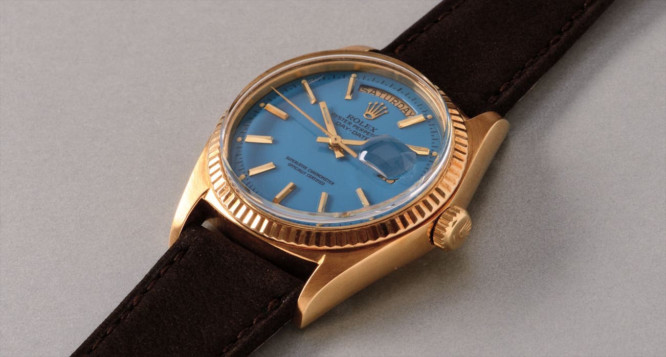 For a period between the 1970s and 1990s, the reference 1803 was produced with vibrant, colored lacquered dials, which had the appearance of enamel known as the “Stella” dial. These rare and desirable dials showcase Rolex’s surprising playfulness and creativity, adding life to the classic Day-Date. The present lot has an extremely attractive “azure blue dial”, that is so beautiful, it is the identical dial color fitted on the watch to feature on the cover of “The Day-Date, The Presidential Rolex” by Pucci Papaelo. Preserved in superb, untouched condition, the present lot will certainly speak to any collector of vintage Rolex watches..