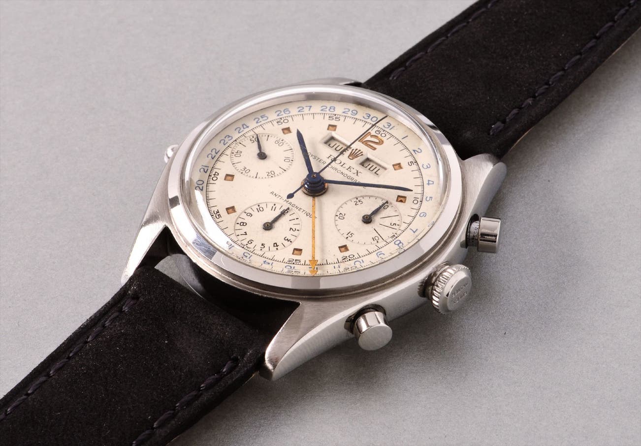 The watches featured various dial variants and hand styles which might have included a silver, yellow gold, or blued steel calendar hand. The present lot features an elegant blue time scale and chronograph hands, perfectly matching the outer blue date track. The yellow gold calendar hand perfectly complements the delightfully recessed, gold Rolex coronet and ‘12’ and pyramidal hour markers. Furthermore the watch features the patented and sporty “Twinlock” double seal crown system, which ensured the watch remained waterproof. This watch will speak to savvy collectors, both for its superb condition and rarity, as well as its unique place as one of the most complicated watches ever made in the history of Rolex.