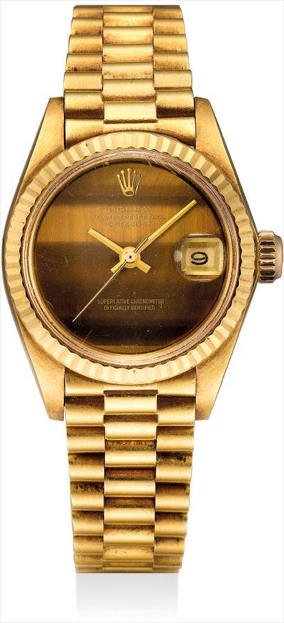 A lady’s fine and rare yellow gold wristwatch with sweep centre seconds, date, tiger’s eye dial and bracelet