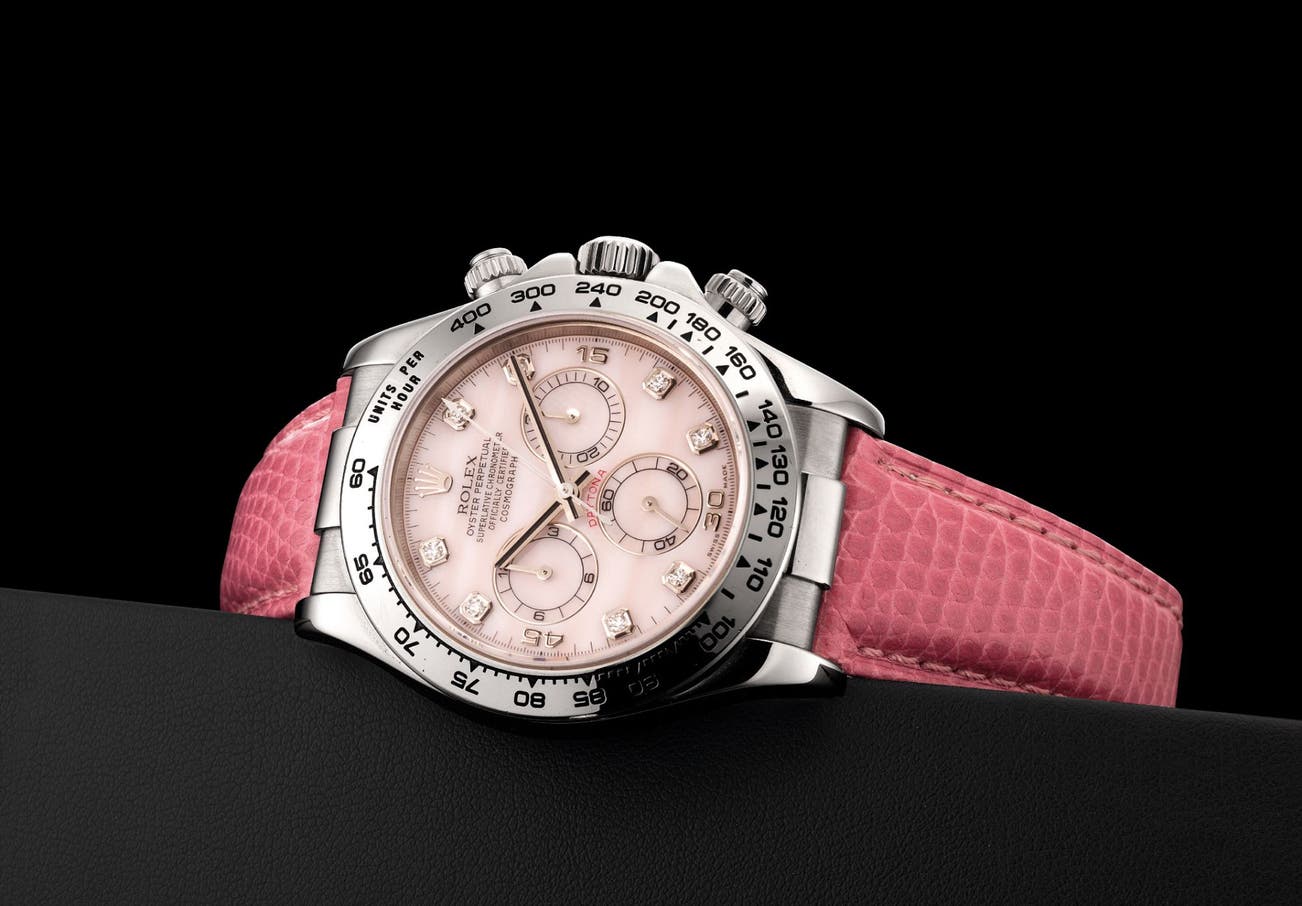 A fine and rare white gold and diamond-set chronograph wristwatch with pink mother-of-pearl dial