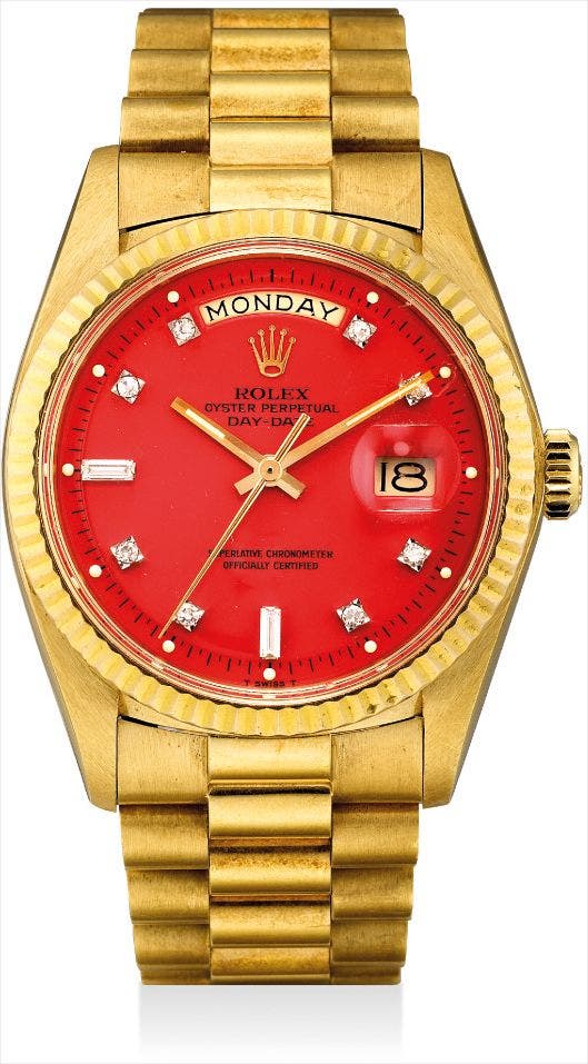 A fine and very rare yellow gold and diamond-set calendar wristwatch with sweep centre seconds, red lacquer 'Stella' dial and bracelet