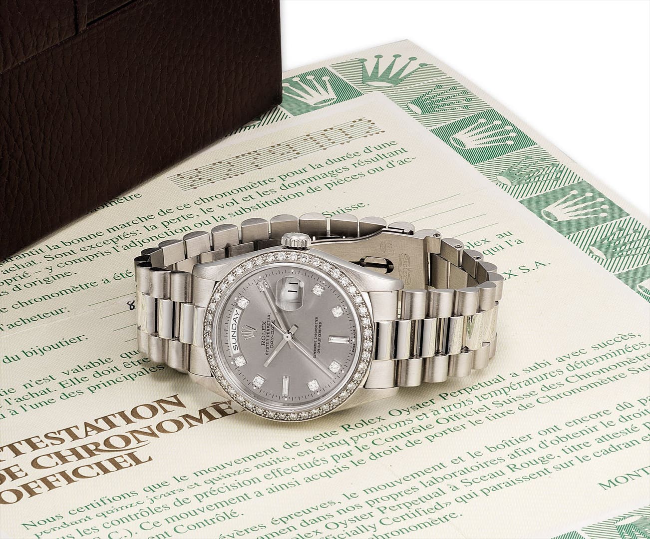 A very fine and rare platinum and diamond-set calendar wristwatch with bracelet, original guarantee and fitted presentation box